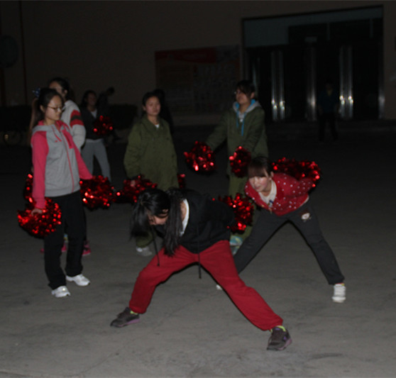 的姑娘和小伙子们正手持啦啦操彩球,她们脸上洋溢着笑容,跳着优美活力的啦啦操。舞动,前进,动作整齐有力,火红的彩球在黑夜中闪耀,她们用身姿诠释着青春的奔放,用热情编织青春的浪漫。手持彩球,时而跳跃,时而蹲立。双手舞动着,彩球飘舞着,严谨的训练,认真的表演,在音乐的带动下,现场的气氛热烈而充满活力,周围的观众不时传来热烈的掌声。
