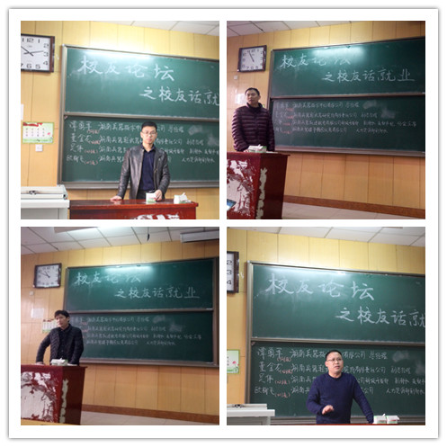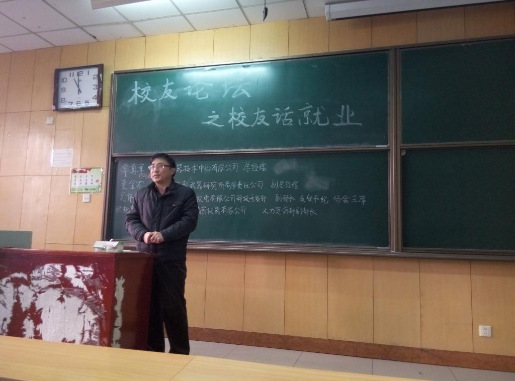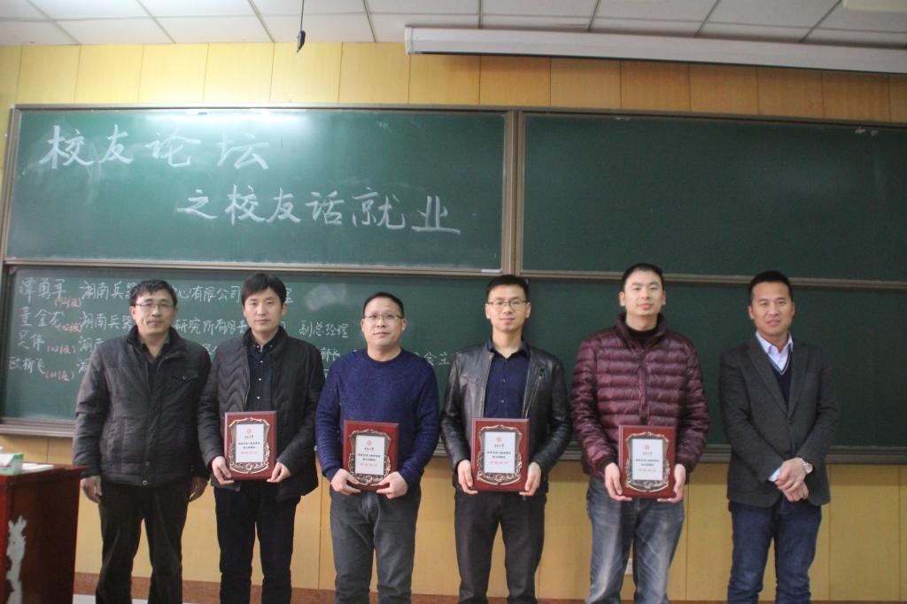 湖南兵器技术中心有限公司谭勇军总经理、轻武器研究所有限责任公司董金龙副总经理、跃进机电有限公司科技开发部吴伟副部长、建华精密仪器有限公司人力资源部欧柳飞部长四位优秀校友分别从道德与智慧的关系、价值观和荣辱观的培养、目标的树立与践行、学习态度的培养等方面与在座师生做了分享,并认真回答了学弟学妹提出的关于学习与工作的问题。李世中老师做了总结发言,鼓励学生努力学习,奋发图强。最后,刘光副书记和李世中副院长为四位优秀校友颁发了职业发展与就业创业特聘讲师证书。