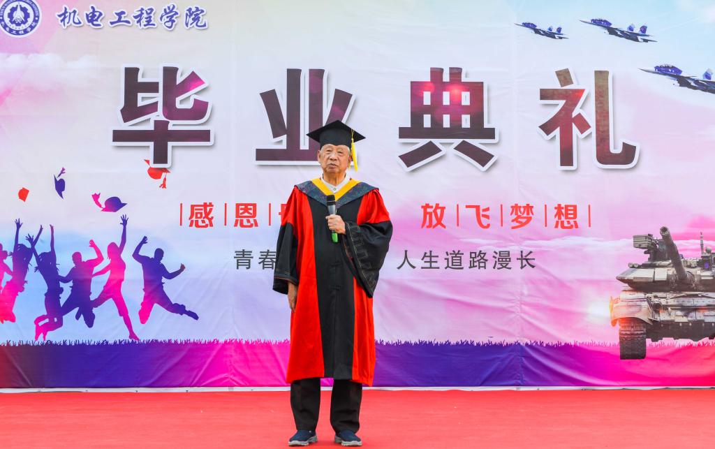 中国工程院朵英贤院士为毕业生致辞,将典礼推向高潮。他说,身处中国特色社会主义建设的关键时期,面对纷繁复杂的国际形势,中北学子当以太行精神武装自己,迈开步伐,自主创新,为祖国国防建设贡献力量!