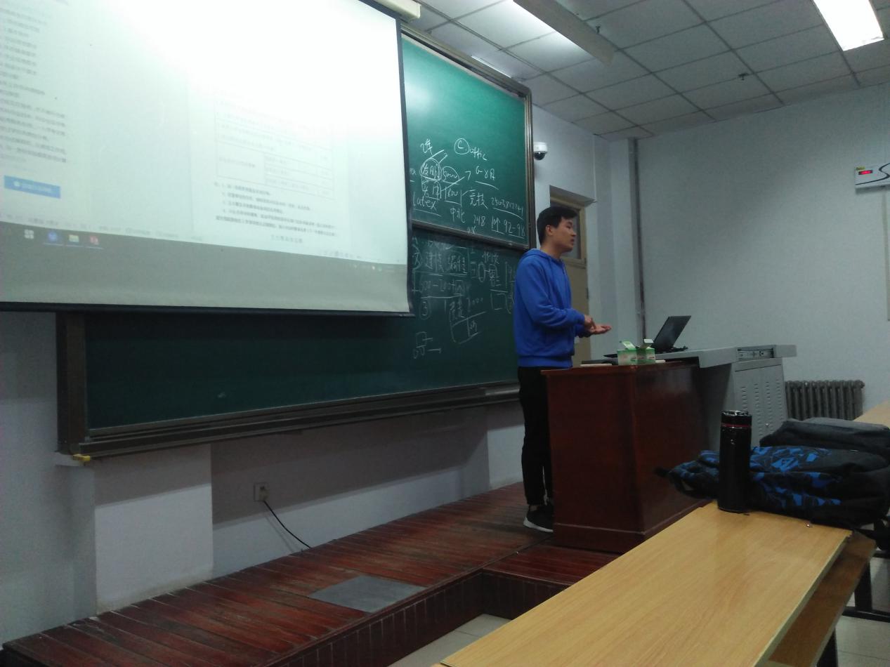 首先,李洋同志结合自身的参赛经验,向大家推荐了大学期间应该和值得参加的比赛种类,为大家详细介绍了全国大学生数学建模竞赛、美国大学生数学建模竞赛,以及华北五省机器人大赛等一系列比赛的特点和注意事项,并且给大家展示了优秀的论文和高尔夫机器人模型,激发了大家的比赛兴趣。