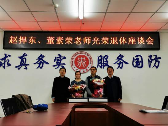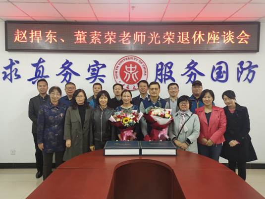 领导与弹药工程与爆炸技术专业教师齐聚一堂,共同欢送赵捍东、董素荣两位教授光荣退休。
