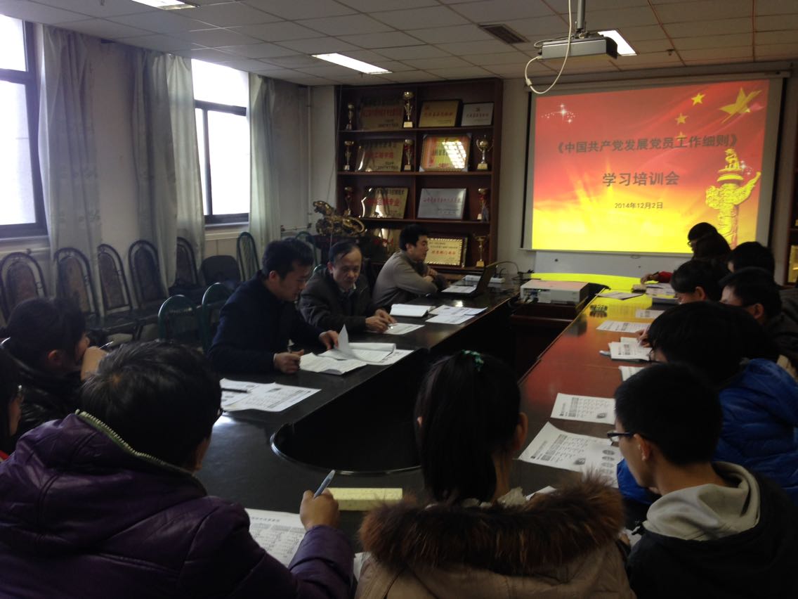 团委书记王宇鹏同志宣布会议开始,会议第一项,由党委副书记刘光同志传达上级党委指示,对新出台的《中国共产党发展党员细则》内容进行简单介绍,并对发展党员的指导思想和问题提出相应的要求。而后,团委书记王宇鹏同志结合刘书记所述细则内容对发展党员工作流程和注意事项分别进行要求。王书记强调此次发展以及今后的发展均严格按照25个发展步骤进行,要求各支部保存发展各步骤原始材料,并对《细则》在程序变动较大的五个环节即申请入党环节、入党积极分子发展环节、发展对象确定环节、预备党员接受环节、预备党员审批环节进行了着重强调,对于其他保存、转接事项进行了说明。会议最后,由党委书记徐建军同志对会议内容进行总结,要求各支部的工作经得起党组织的考察和检验,并对大学生入党的形势进行分析,要求各支部书记、支部委员工作到位,建议实行新的工作模式即学生支部联合教职工支部进行支部活动建设。至此,《中国共产党发展党员工作细则》学习培训会圆满成功。