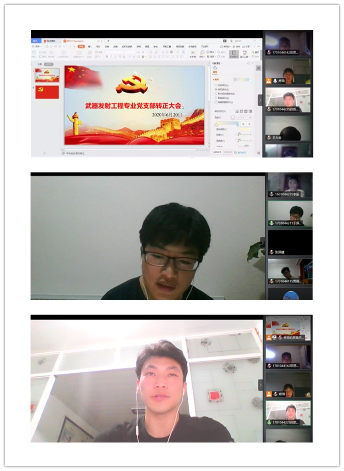 段老师宣读完决议后,表达了对16级毕业生的祝福以及接下来武器发射工程专业党支部的工作安排。随后,所有转正的预备党员及全体支部成员起立面向屏幕党旗,庄严宣誓。最后,支部原副书记薛淑娟同志发言,表达了对大四毕业生的祝福以及对大二、大三学生的期望。