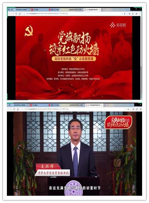 首先,我们观看了“党旗飘扬,筑牢红色防火墙高校党组织战役示范微党课”,让党旗始终高高飘扬在疫情防控、返校复学、事业发展全过程,全方位。其中,清华大学党委常务副书记姜胜耀及北京大学党委书记邱水平提到,医者仁心的养成绝非一朝之功,而是靠党的建设,靠把思想政治工作贯彻始终。将党的政治优势、组织优势、行政优势转化为疫情防控的强大优势。这次疫情中,我国强大的组织能力、动员能力和协调能力让世人震撼。最后视频中讲到,青年学子只有坚定理想信念、传承爱国精神、练就过硬本领,才能升华人生价值。让青春在党和人民最需要的地方绽放绚丽之花。