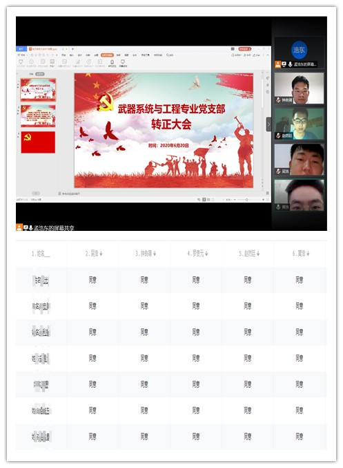 武器系统与工程专业党支部于线上腾讯会议召开预备党员转正大会。本次大会由孟浩东同志主持,讨论关于钟良靖、赵然廷、吴浩、黄浩、罗贵元同志的转正问题。出席本次转正大会的有党支部书记刘光老师以及各位支部成员,支部成员应到19人,实到19人。