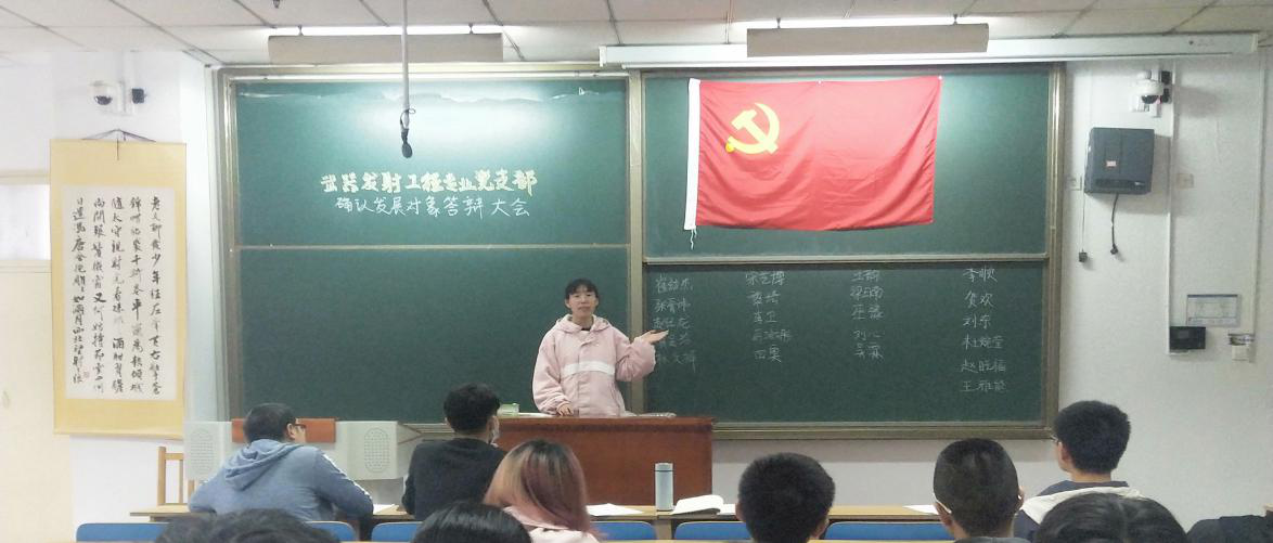 2020年10月10日下午四点十分,武器发射工程专业党支部在11105教室召开了确认2020年秋季最终发展对象的答辩大会,本次会议由支部副书记杨雪主持,支部支委、部分党员及全体发展对象参加此次会议。杨雪同志首先向大家介绍此次会议的内容,在介绍完本次答辩需要注意的问题后,会议正式开始。首先,各发展对象依次上台进行答辩。答辩内容主要包括自我介绍、个人经历以及入党动机等方面。所有成员完成答辩后,支部成员本着公平公正的原则对他们的答辩情况进行了评估,最终确定了杜婉莹等11位同志为最终的发展对象。
