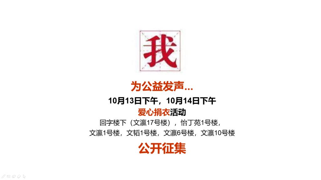 捐衣地点:回字楼下(文瀛17号楼),怡丁苑1号楼,文瀛1号楼,文韬1号楼,文瀛6号楼,文瀛10号楼。